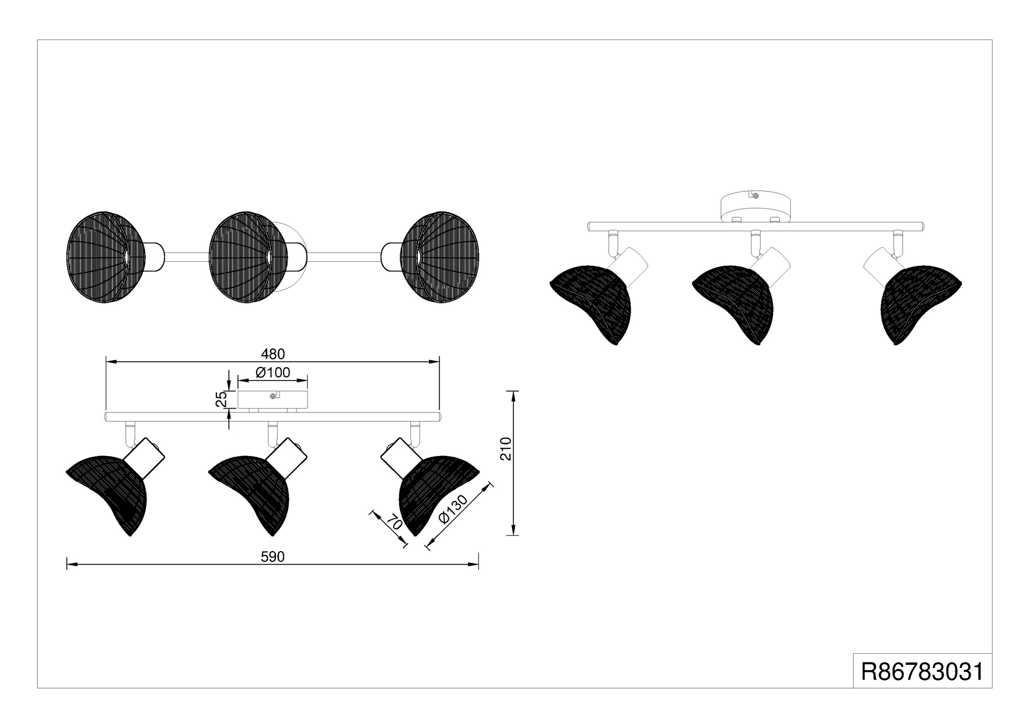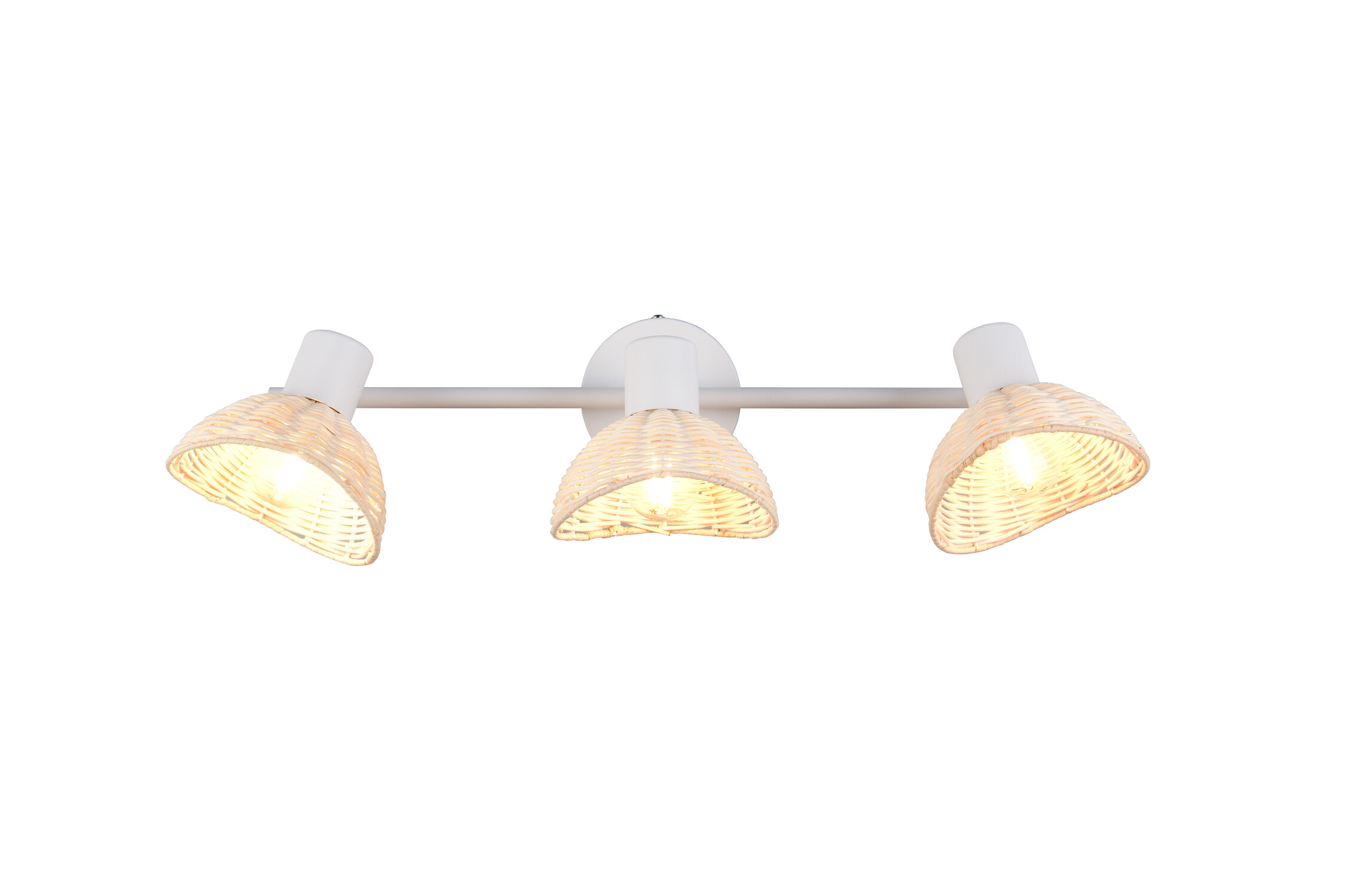 Triple éclairage au style bohèmeLa barre de spots CALVI (R86783031) est un plafonnier élégant. Sa structure en métal blanc mat soutient 3 abat-jours orientables en rotin tressé naturel.. Longue de 48cm, elle est parfaite pour une cuisine ou une entrée. Elle est conçue pour 3 ampoules E14 (non incluses). La série CALVI combine un métal moderne (blanc ou noir) au charme naturel du rotin tressé. | Type d'ampoule | Sphérique E14 (non inclus(e)) | | Puissance | max.10W | | Variation | Compatible | | Alimentation / Normes | 220V/Cl1/IP20 | | Dimensions | 130* 310* 590 mm | | Matière(s) Principale(s) | Métal et rotin | | Couleur/Finition | Blanc mat/rotin | | Position / Fixation | A fixer au mur ou plafond | | Utilisation | En intérieur | | Accessoire(s) | | | Garantie | 2 ans |