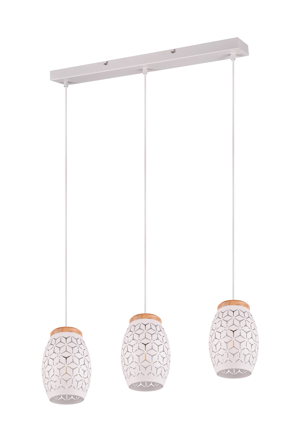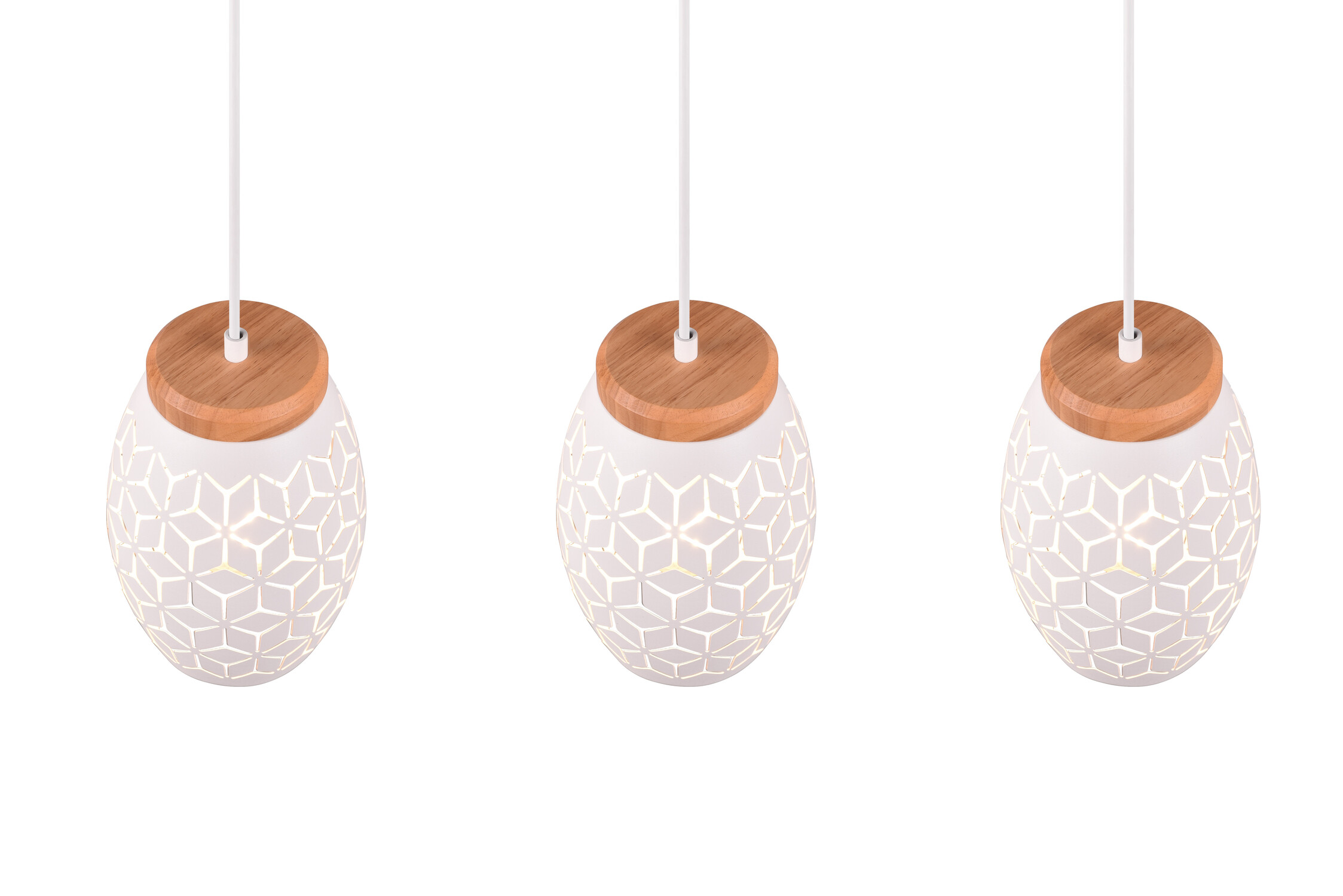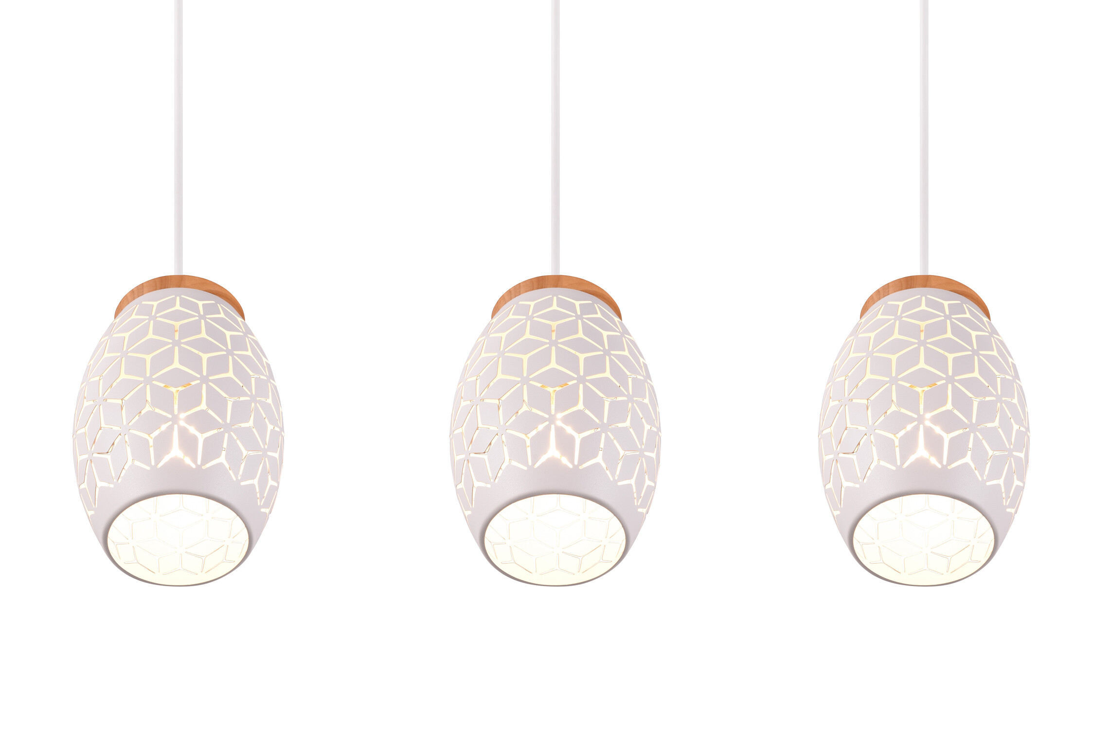 BIDAR Blanc Mat - Triple lumière poétique La suspension BIDAR (R31573031) en blanc mat réunit 3 points lumineux pour un éclairage généreux. Chaque abat-jour projette son jeu de lumière à travers les motifs ajourés. 3 culots E27 compatibles LED (non fournies). Accents en bois naturel. Hauteur réglable. Format idéal pour illuminer une table à manger ou un îlot de cuisine.. Suspension BIDAR 3 lumières de Reality Leuchten : éclairage principal avec charme ajouré. IP20. Classe II. Livraison France et Belgique.