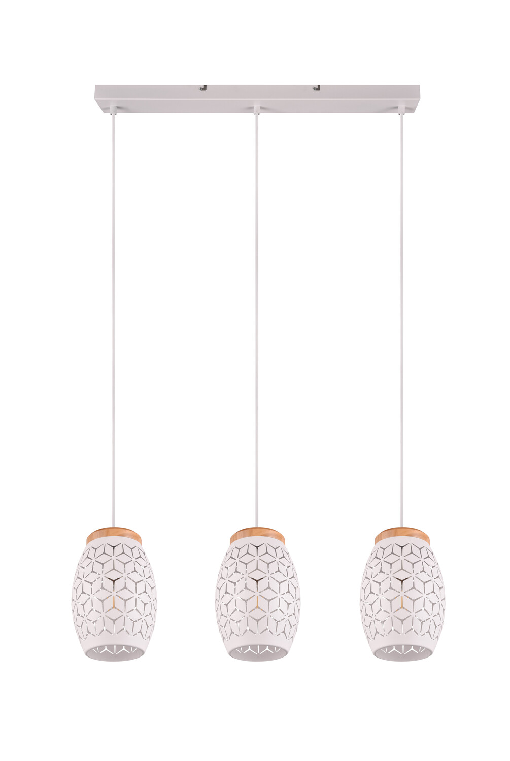 BIDAR Reality : luminaires motifs ajourés, métal et bois naturel, jeu de lumière décoratif. Suspension, lampadaire, lampe table, plafonnier, applique. Blanc, brun, noir/or. | Type d'ampoule | Standard E27 (non inclus(e)) | | Puissance | max.3*10W | | Variation | Compatible | | Alimentation / Normes | 220V / Cl1 | | Dimensions | 150* max.1500 mm | | Matière(s) Principale(s) | Métal et bois | | Couleur/Finition | Blanc mat/bois | | Position / Fixation | A fixer au plafond | | Utilisation | En intérieur | | Accessoire(s) | | | Garantie | 2 ans |