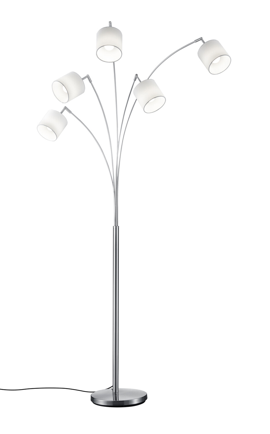 Un grand arc de lumière pour votre salonLe lampadaire TOMMY (R46330501) offre un large éclairage d'ambiance. Sa structure arquée en nickel mat atteint 200cm de hauteur et supporte 5 abat-jours cylindriques en tissu blanc.. Ce design épuré est idéal pour un intérieur moderne ou scandinave. Il est équipé d'un interrupteur au pied. Il fonctionne avec 5 ampoules E14 (non incluses). La série TOMMY combine des abat-jours en tissu et une structure en métal pour une ambiance chaleureuse. | Type d'ampoule | Sphérique E14 (non inclus(e)) |  | Puissance | max.5*10W  |  | Variation | Non Compatible |  | Alimentation / Normes | 220V/Cl2/IP20 |  | Dimensions | 715* 2000 mm |  | Matière(s) Principale(s) | Métal et tissu |  | Couleur/Finition | Nickel mat/Blanc |  | Position / Fixation | A poser |  | Utilisation | En intérieur |  | Accessoire(s) |  |  | Garantie | 2 ans |