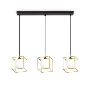 Le lustre LINGOTTO enferme les 3 globes blancs dans des cages carrées métalliques en finition laiton et noire