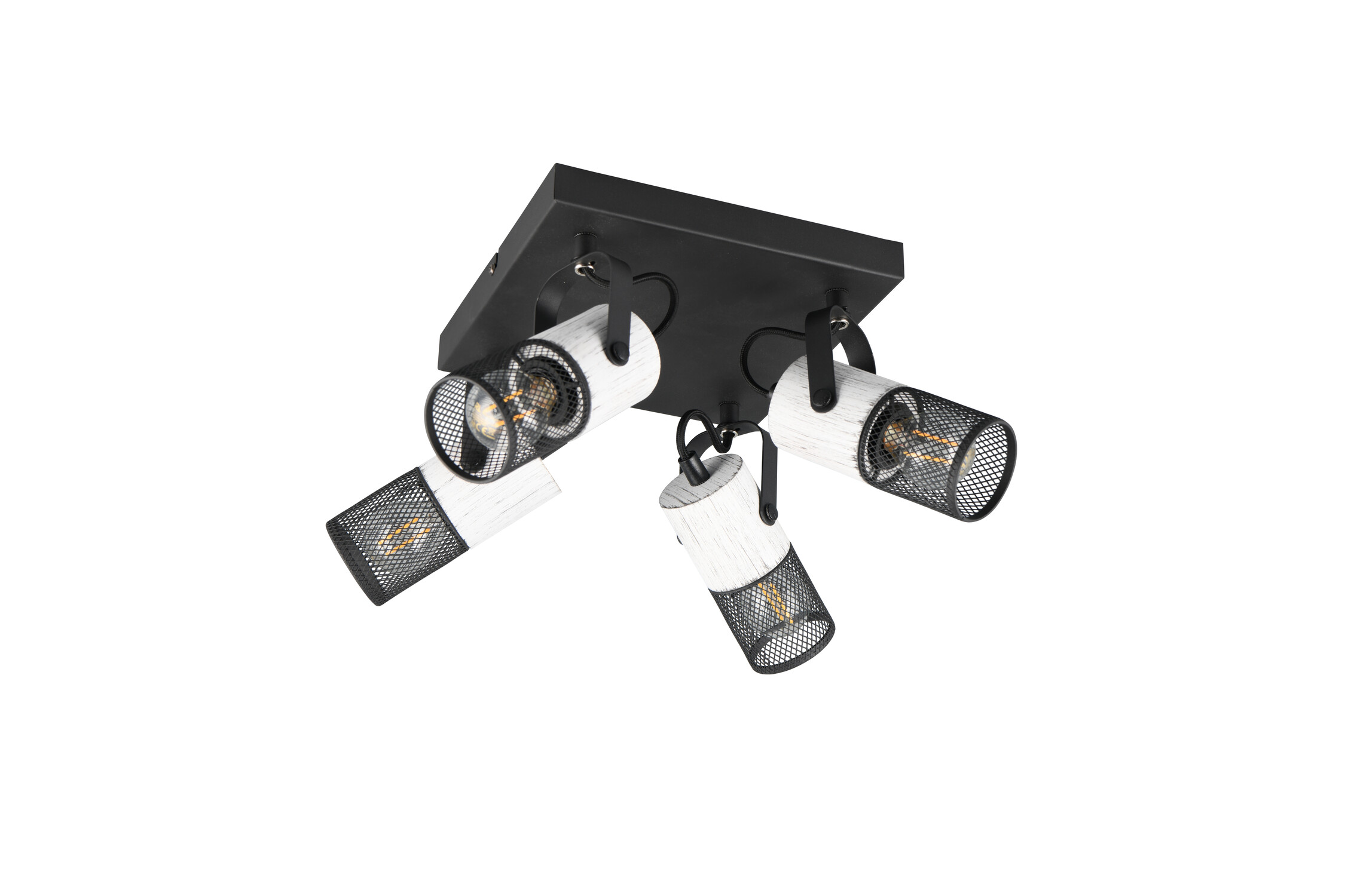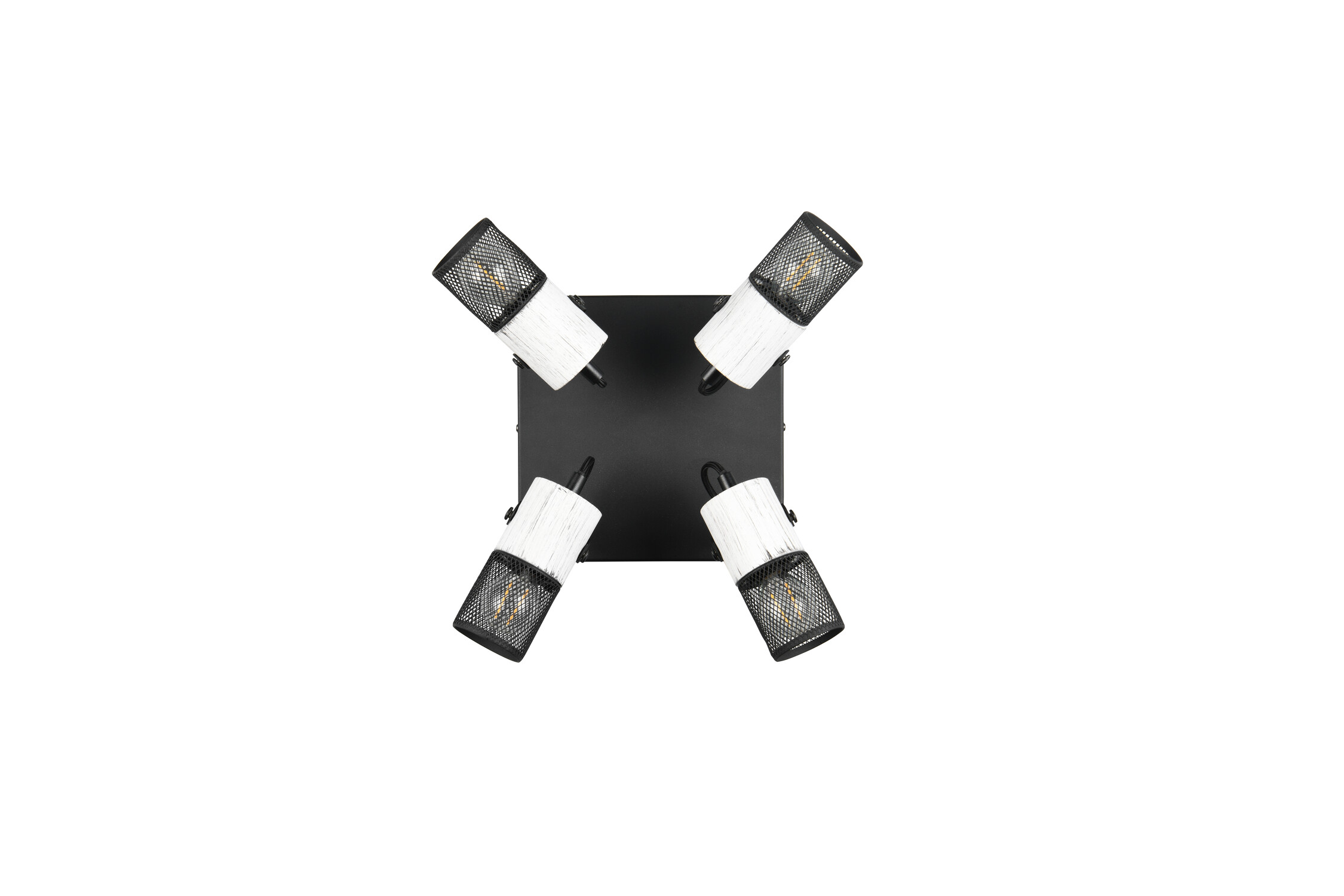 Plafonnier 4 spots TOSH Noir mat & Bois blanc Le plafonnier TOSH (804300434) associe le métal noir mat au bois blanc pour un style moderne et contrasté. Ses 4 abat-jours en résille métallique sont orientables pour diriger la lumière dans toutes les directions.