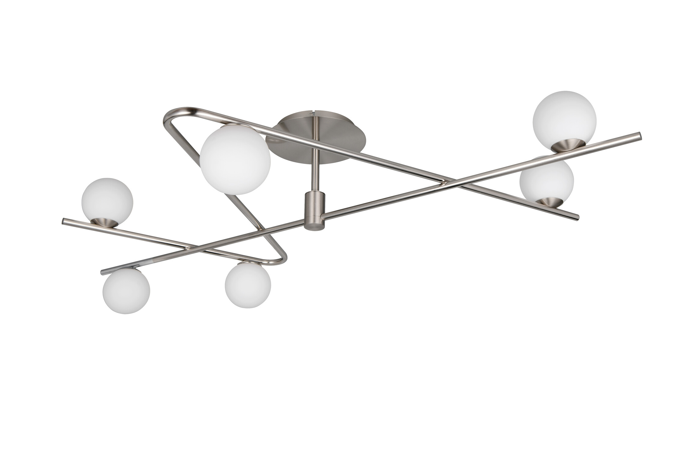 FLAMING : Plafonnier 6 Spots D'Ambiance - Nickel Mat / VerreCe plafonnier FLAMING (668900607) est la version plafond de la suspension, idéale pour les pièces où la hauteur sous plafond est limitée. Il dispose de six diffuseurs en verre sur une structure en Nickel Mat qui assurent une distribution uniforme et chaleureuse de la lumière.. Son design discret, mais élégant, le rend parfait pour un salon ou une grande chambre à coucher. Il crée une ambiance d'éclairage d'accentuation et général très confortable. Nécessite six ampoules G9 (max 10W par ampoule, non incluses). FLAMING : Design rond et élégant, combinant le Nickel Mat ou le Noir/Or avec une verrerie opale. | Type d'ampoule | Led G9 (non inclus(e)) | | Puissance | max 6*10W | | Variation | Compatible | | Alimentation / Normes | 220V/Cl2 | | Dimensions | 1200* 775* 280 mm | | Matière(s) Principale(s) | Métal & verre | | Couleur/Finition | Nickel mat & blanc | | Position / Fixation | A fixer au plafond | | Utilisation | En intérieur | | Accessoire(s) | | | Garantie | 2 ans |
