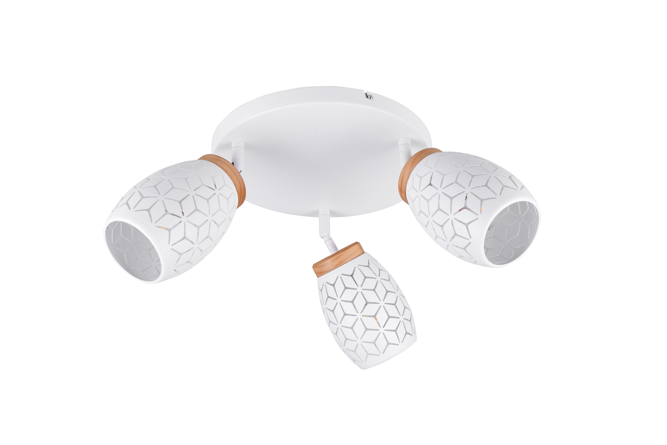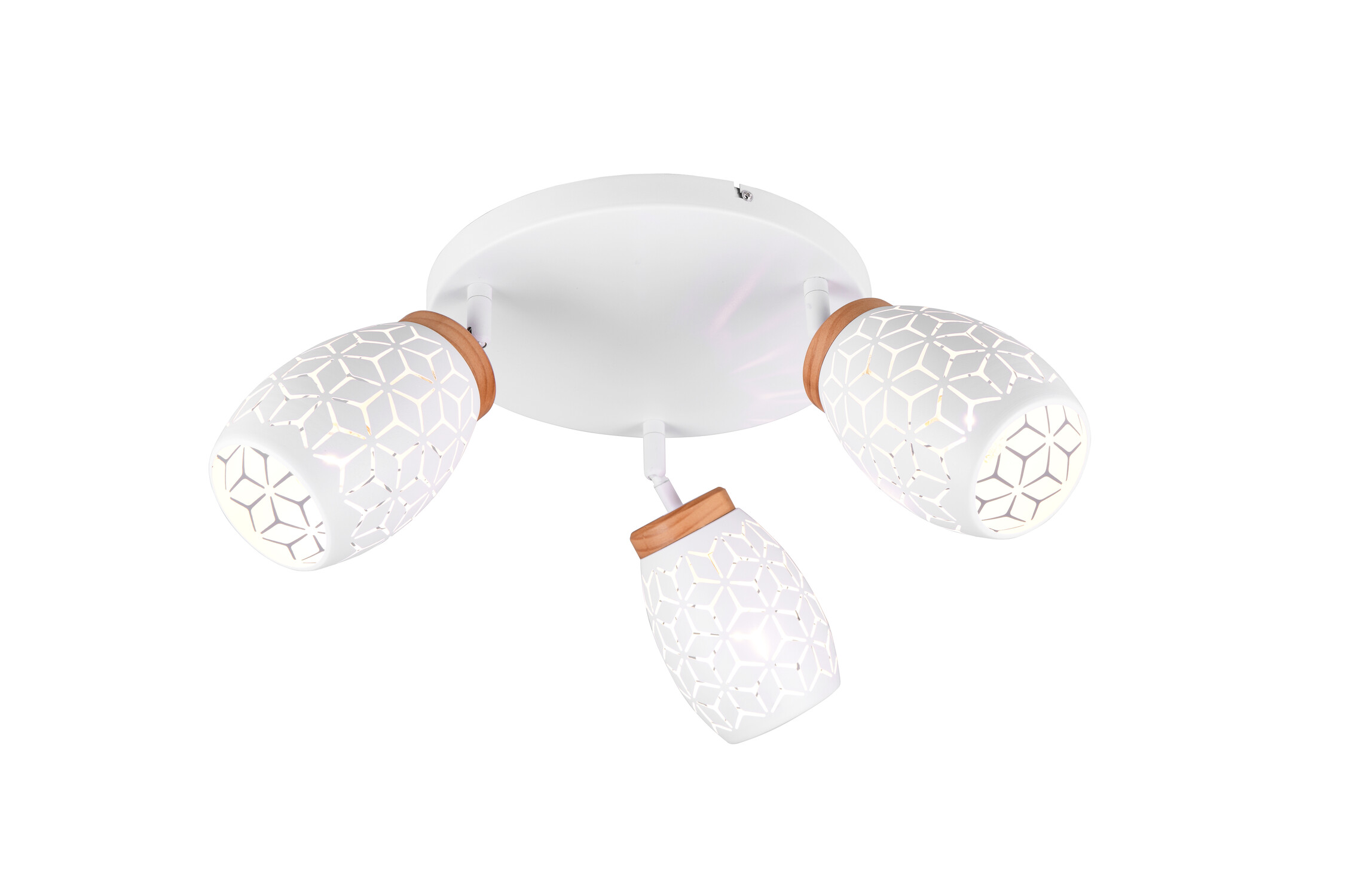 BIDAR Reality : luminaires motifs ajourés, métal et bois naturel, jeu de lumière décoratif. Suspension, lampadaire, lampe table, plafonnier, applique. Blanc, brun, noir/or. | Type d'ampoule | Standard E27 (non inclus(e)) | | Puissance | max.3*10W | | Variation | Compatible | | Alimentation / Normes | 220V / Cl1 | | Dimensions | Ø300* 270 mm | | Matière(s) Principale(s) | Métal et bois | | Couleur/Finition | Blanc mat/bois | | Position / Fixation | A fixer au plafond | | Utilisation | En intérieur | | Accessoire(s) | | | Garantie | 2 ans |