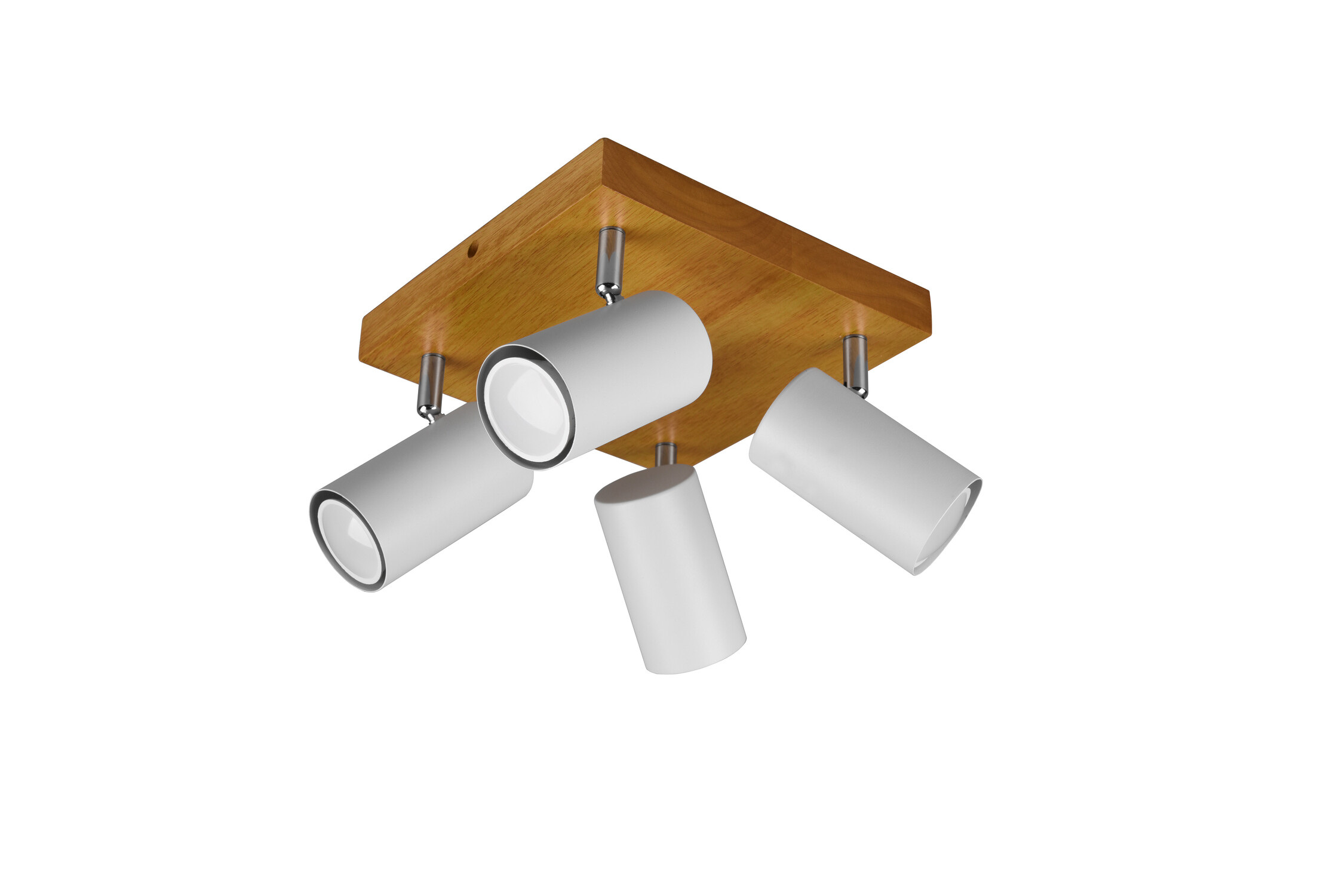 Plafonnier carré 4 spots polyvalents en Blanc Mat et Bois (40W Max)Une lumière parfaite et orientable ! Les projecteurs MARLEY ne sont pas seulement pratiques par leur forme et leur fonction, mais surtout par leur aspect minimaliste ! Le support en bois ajoute une chaleur bienvenue.. Les quatre spots sont orientables individuellement et peuvent être dirigés selon les besoins. Elle nécessite quatre ampoules GU10 remplaçables (non fournies, max 10W chacune). Spots MARLEY GU10 remplaçables, design minimaliste et orientable. | Type d'ampoule | Spot Gu10 (non inclus(e)) | | Puissance | max.4*10W | | Variation | Compatible | | Alimentation / Normes | 220V/Cl1 | | Dimensions | 220* 220* 160 mm | | Matière(s) Principale(s) | Métal | | Couleur/Finition | Blanc mat/bois | | Position / Fixation | A fixer au plafond | | Utilisation | En intérieur | | Accessoire(s) | | | Garantie | 2 ans |