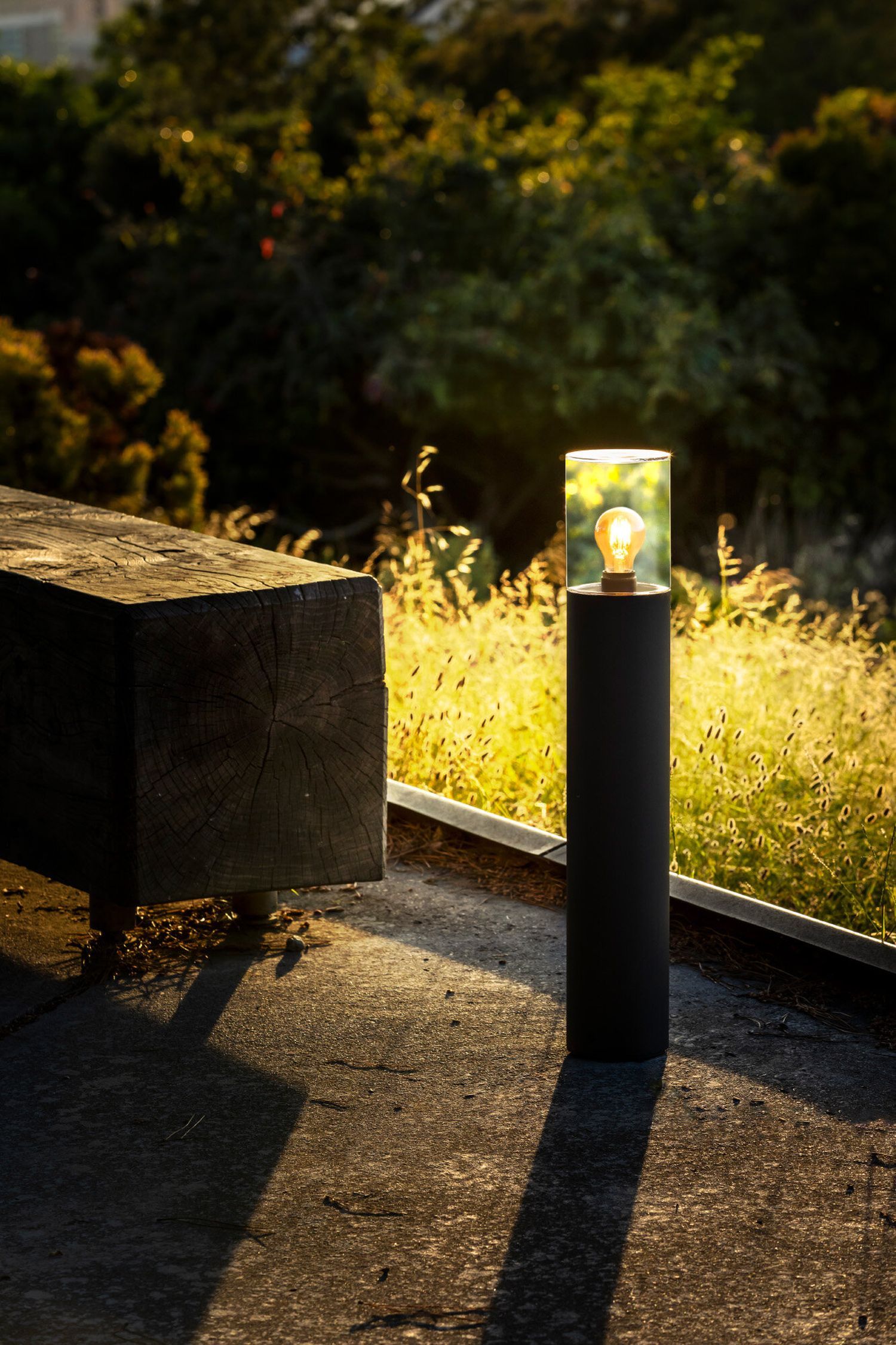 KILA est une collection de luminaires extérieurs fabriqués en aluminium et en verre. L'ampoule (non incluse) est démontable et remplaçable. Ce potelet, pour l'éclairage des jardins et des terrasses, diffuse sa lumière sur 360°.