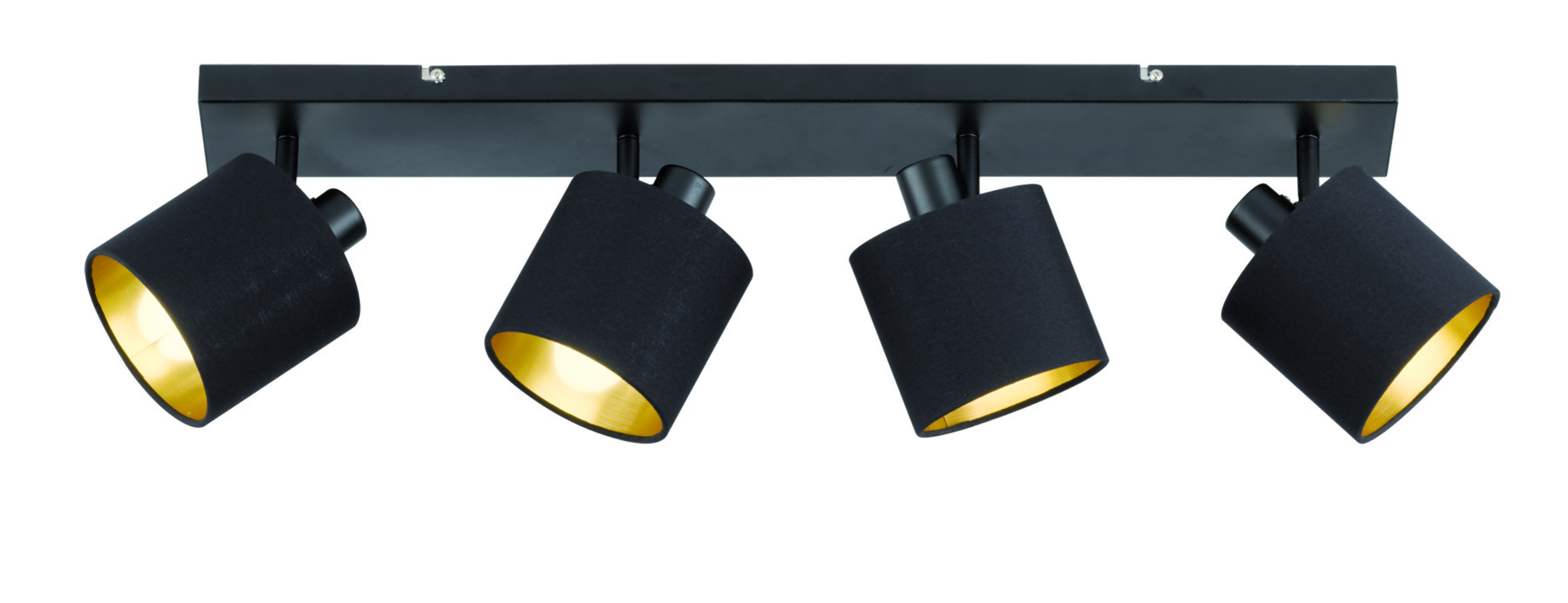 La barre de spots TOMMY (R80334079) combine design et puissance. Sa structure de 70cm en métal noir mat est complétée par 4 abat-jours en tissu noir à intérieur doré, pour une lumière riche et chaude.. Ce luminaire est conçu pour 4 ampoules E14 (non incluses). Les têtes de spot sont orientables.