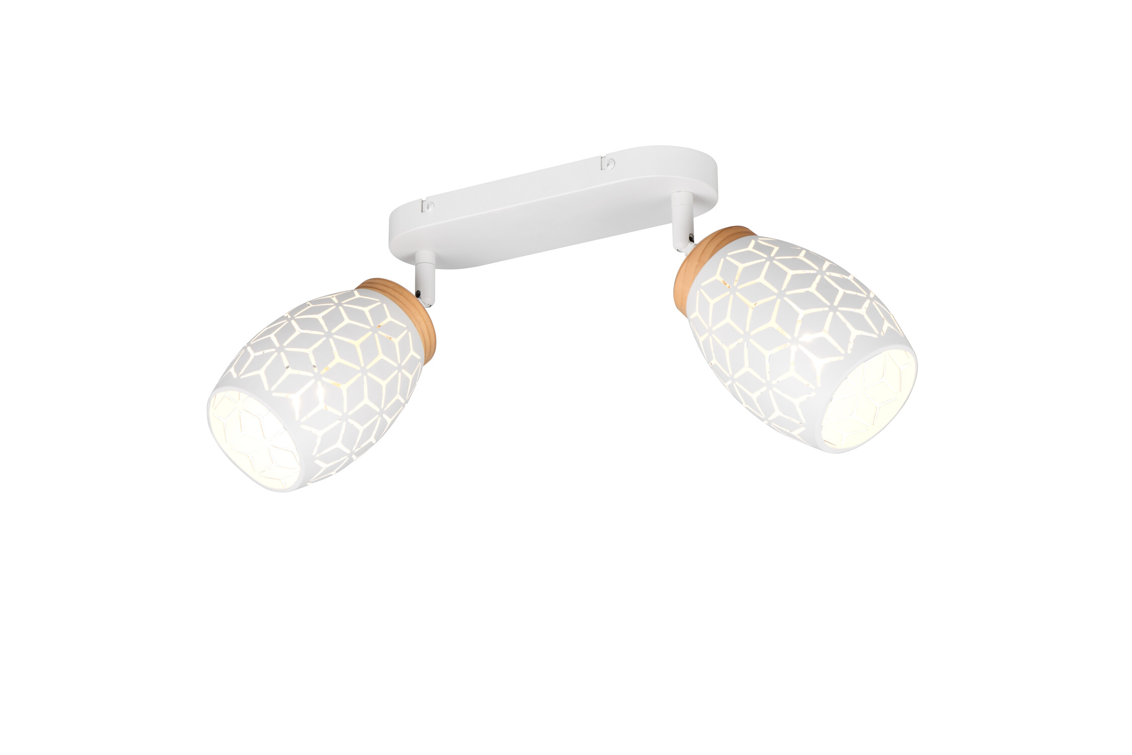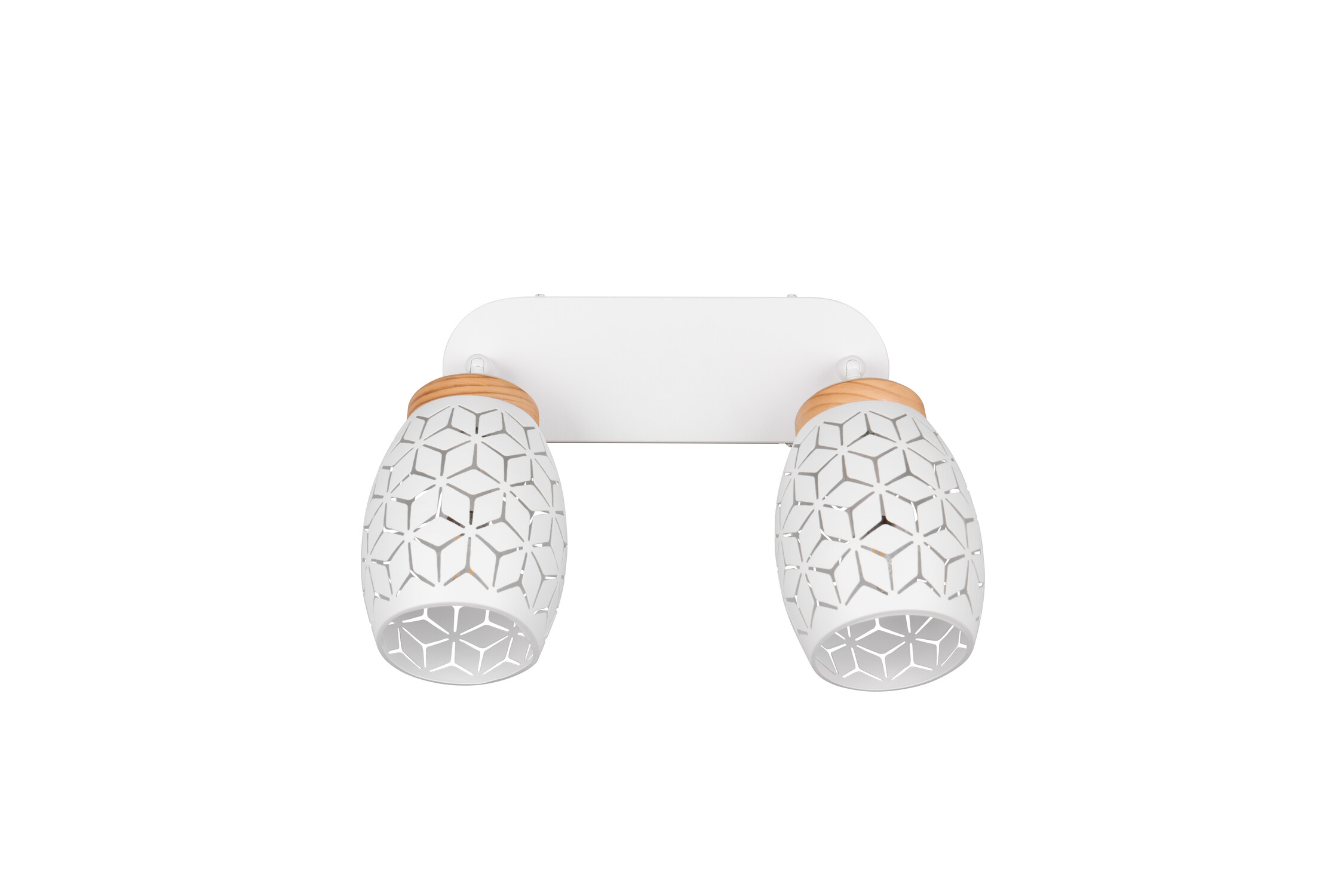 BIDAR Reality : luminaires motifs ajourés, métal et bois naturel, spots orientables. Blanc, brun, noir/or. | Type d'ampoule | Sphérique E14 (non inclus(e)) | | Puissance | max.2*10W | | Variation | Compatible | | Alimentation / Normes | 220V / Cl1 | | Dimensions | 150* 270* 280 mm | | Matière(s) Principale(s) | Métal et bois | | Couleur/Finition | Blanc mat/bois | | Position / Fixation | A fixer au mur ou plafond | | Utilisation | En intérieur | | Accessoire(s) | | | Garantie | 2 ans |
