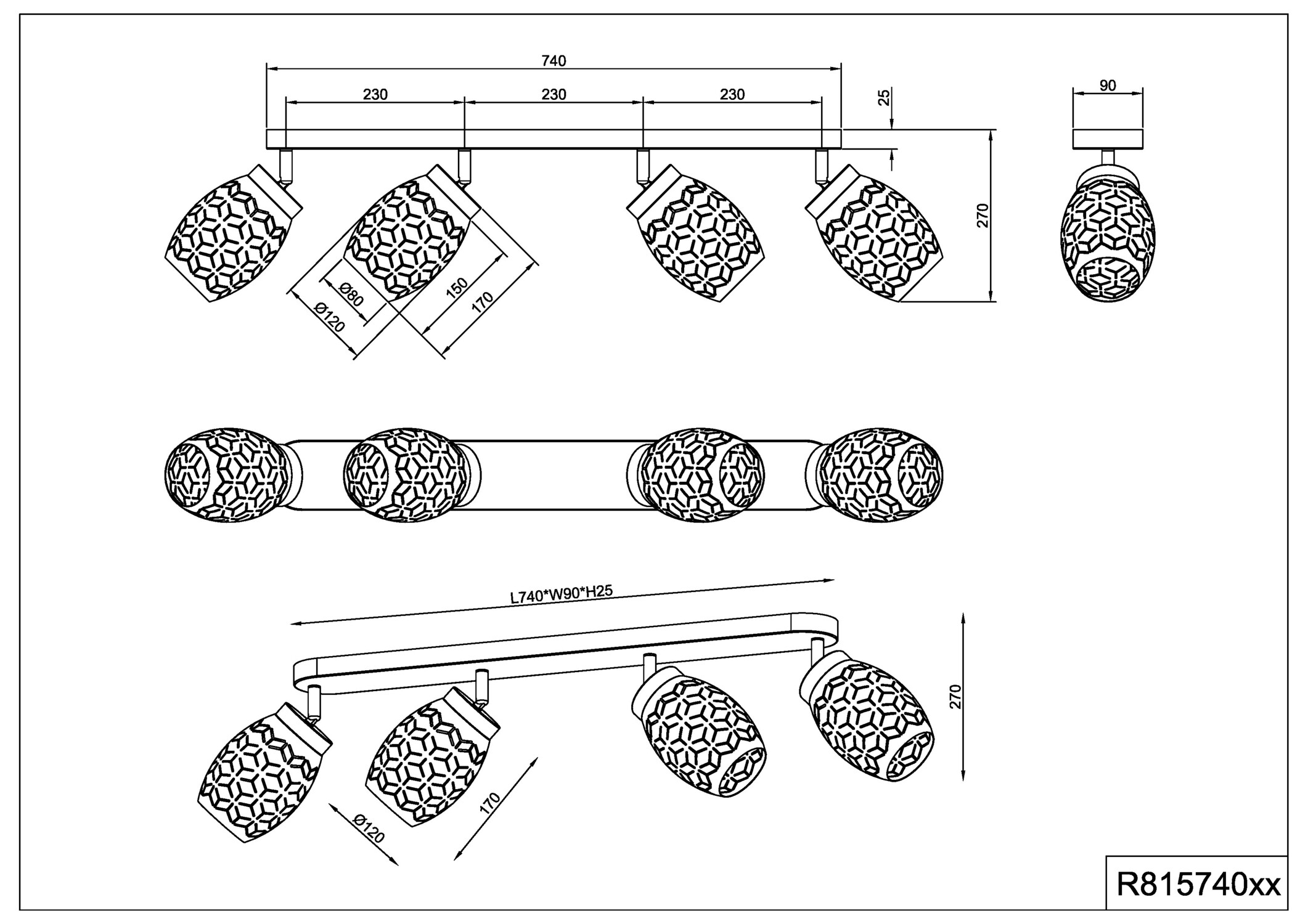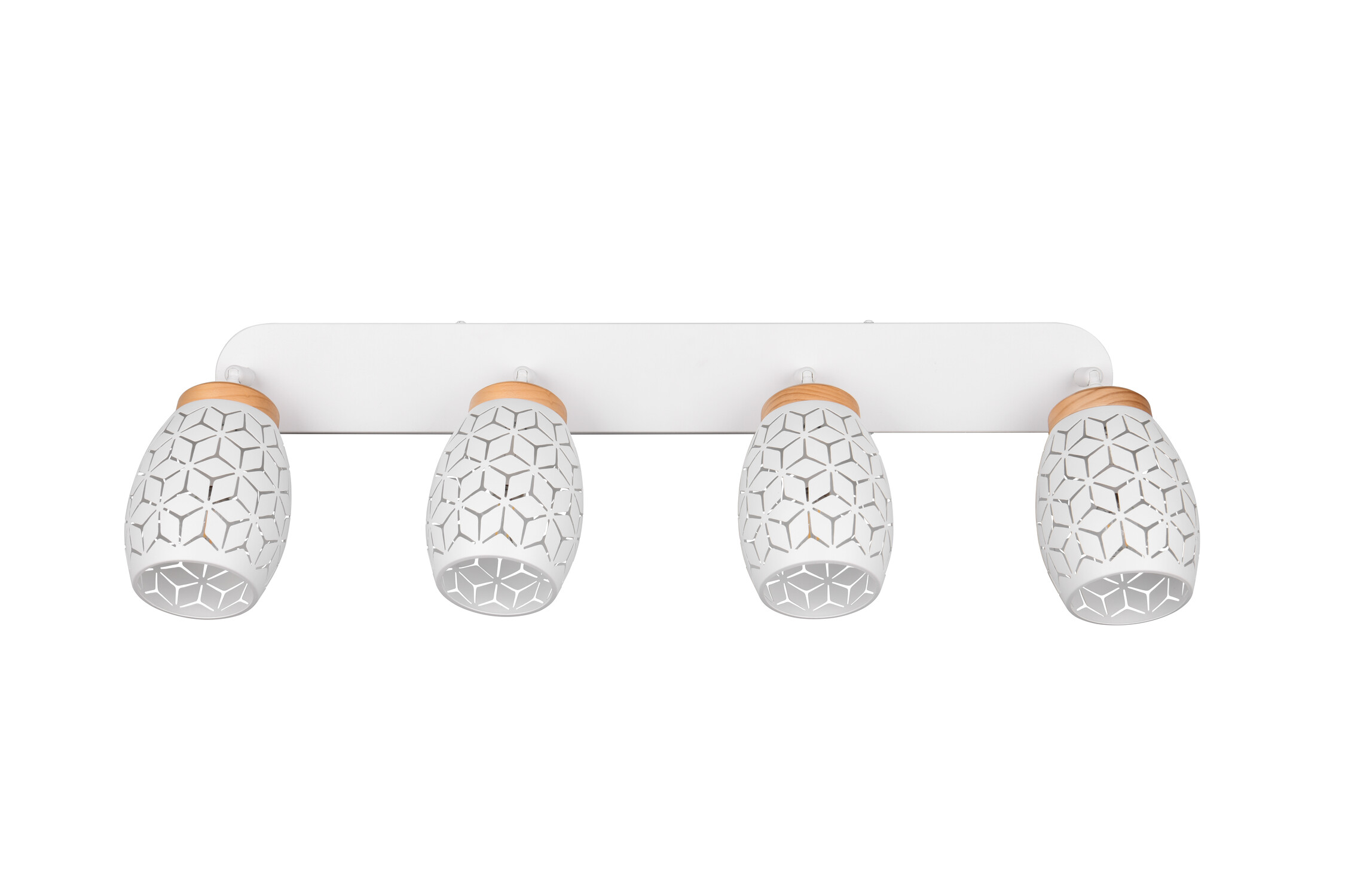 BIDAR Reality : luminaires motifs ajourés, métal et bois naturel, spots orientables. Blanc, brun, noir/or. | Type d'ampoule | Sphérique E14 (non inclus(e)) | | Puissance | max.4*10W | | Variation | Compatible | | Alimentation / Normes | 220V / Cl1 | | Dimensions | 150* 270* 740 mm | | Matière(s) Principale(s) | Métal et bois | | Couleur/Finition | Blanc mat/bois | | Position / Fixation | A fixer au mur ou plafond | | Utilisation | En intérieur | | Accessoire(s) | | | Garantie | 2 ans |