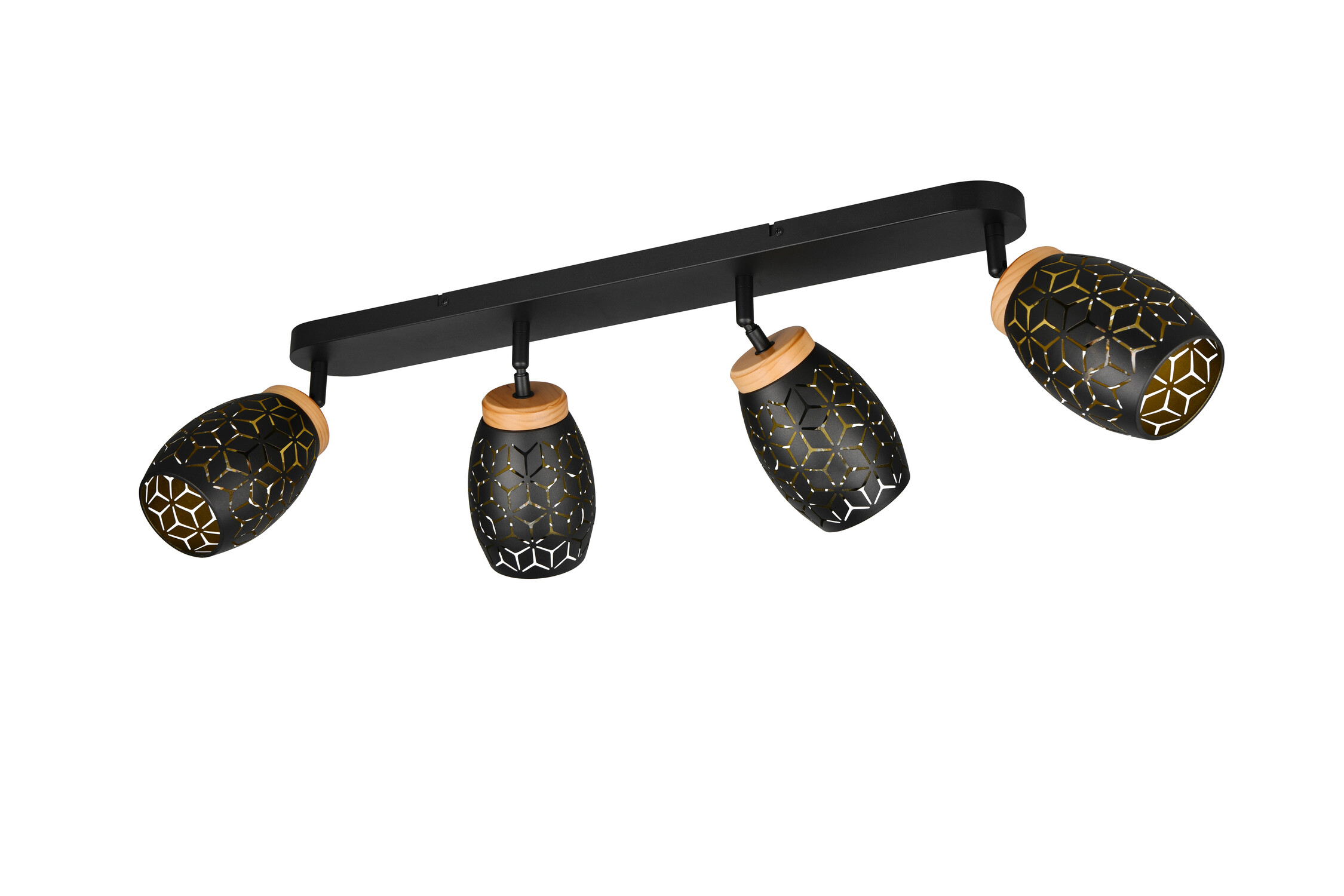 BIDAR Reality : luminaires motifs ajourés, métal et bois naturel, spots orientables. Blanc, brun, noir/or. | Type d'ampoule | Sphérique E14 (non inclus(e)) | | Puissance | max.4*10W | | Variation | Compatible | | Alimentation / Normes | 220V / Cl1 | | Dimensions | 150* 270* 740 mm | | Matière(s) Principale(s) | Métal et bois | | Couleur/Finition | Noir-doré/bois | | Position / Fixation | A fixer au mur ou plafond | | Utilisation | En intérieur | | Accessoire(s) | | | Garantie | 2 ans |