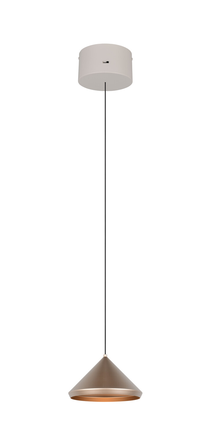 Suspension LAGUNA 1 Cône Café LED 5W - 3 Températures La suspension LAGUNA (336210165) présente un élégant cône couleur café (bronze chaud) au design épuré. LED 5W / 500lm intégrée avec sélecteur de température sur la base pour choisir votre ambiance lumineuse.