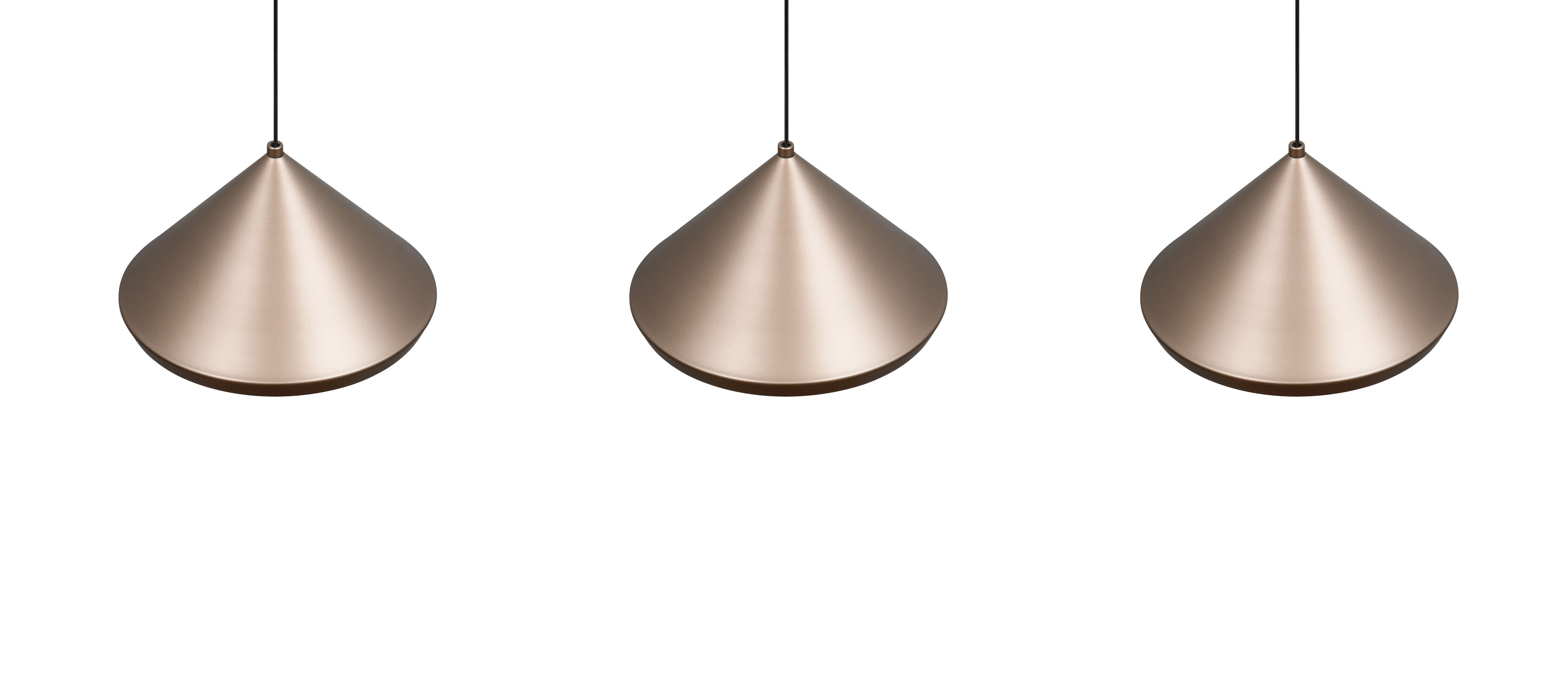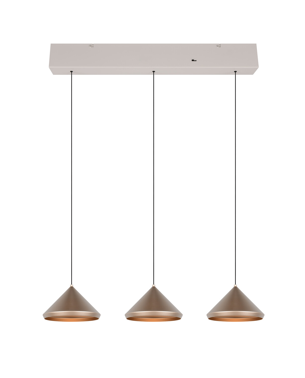 Suspension LAGUNA 3 Cônes Café LED 15W - 3 Températures La suspension LAGUNA (336210365) présente 3 cônes couleur café alignés sur une barre assortie. LED 3×5W / 1500lm intégrée avec sélecteur de température pour une ambiance personnalisée.