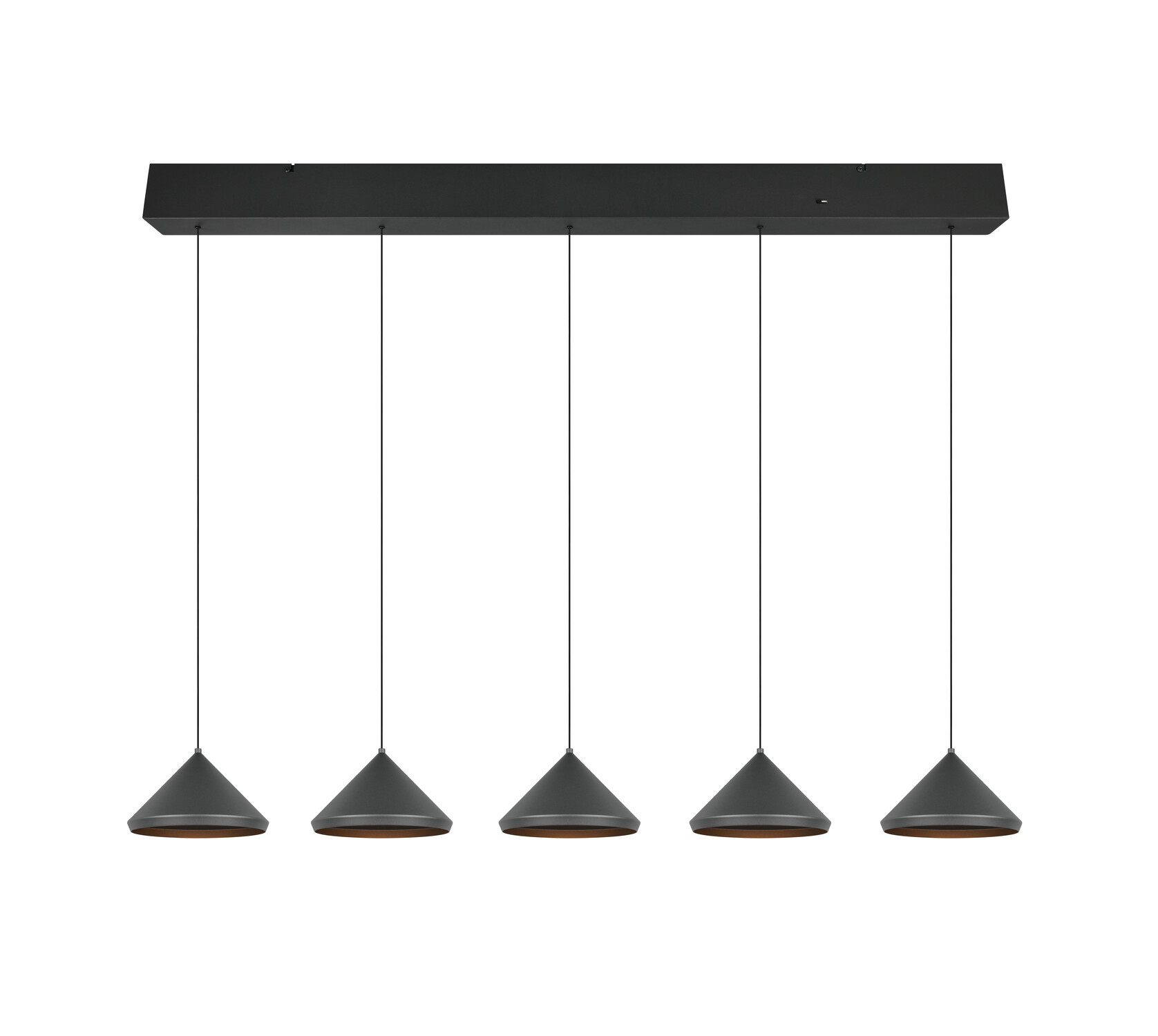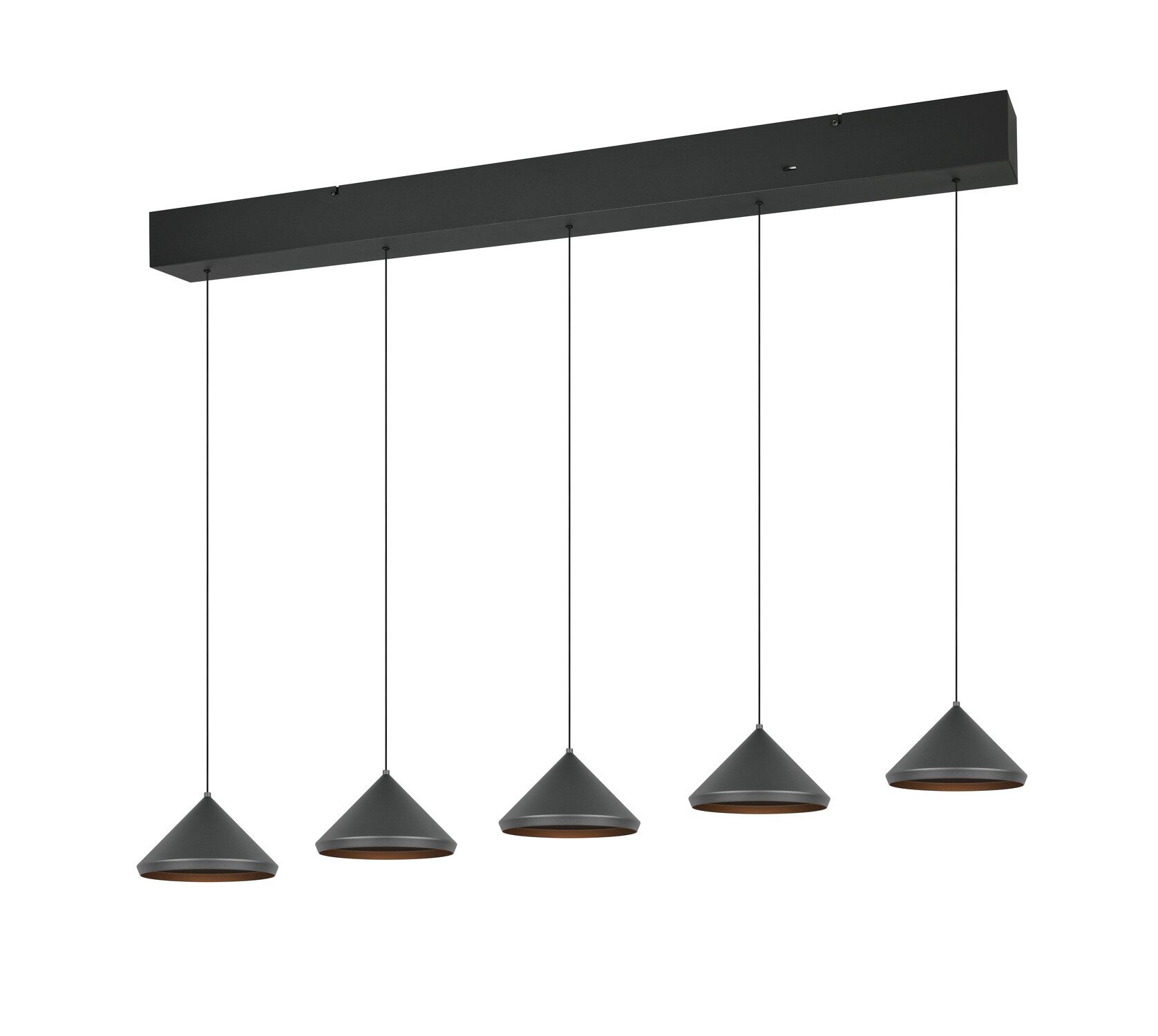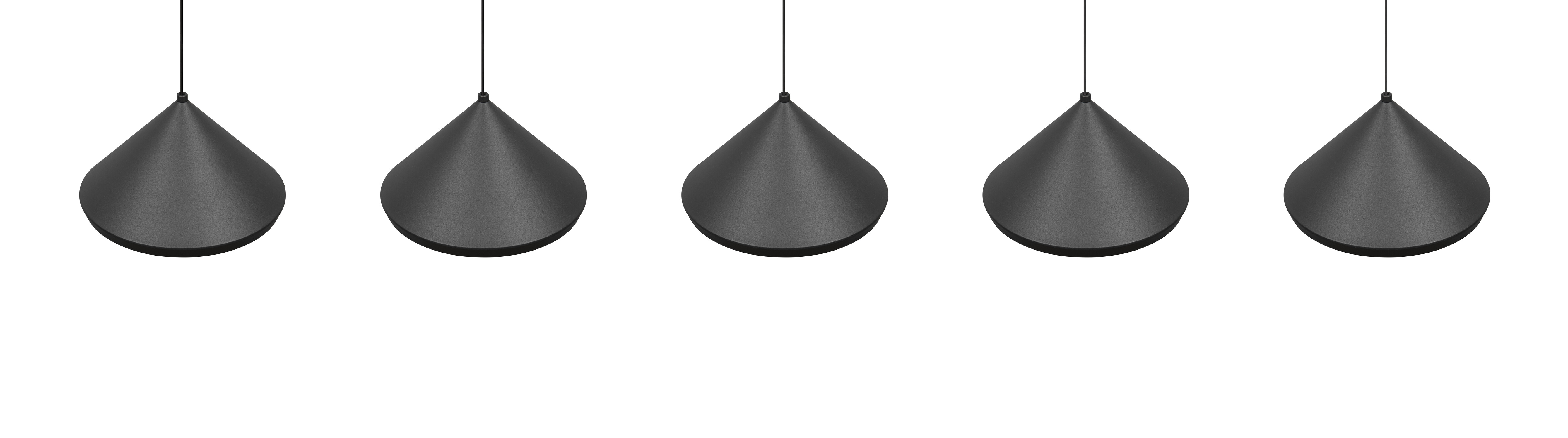 Suspension LAGUNA 5 Cônes Noir Mat LED 25W - 3 Températures La suspension LAGUNA (336210532) impressionne avec ses 5 cônes noirs mats alignés sur une longue barre. LED 5×5W / 2500lm pour un éclairage généreux avec sélecteur de température sur la base.