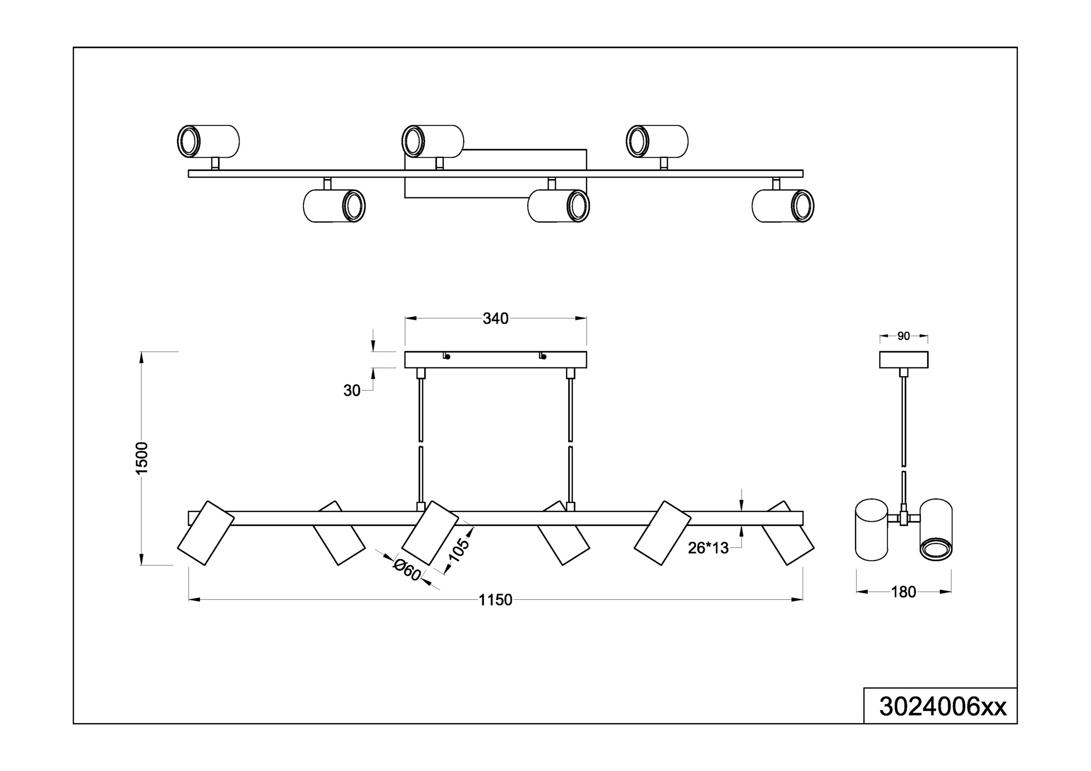 Questions FréquentesQuelle ampoule faut-il ?Six ampoules de type GU10 (non fournies). Est-ce que l'ampoule est remplaçable ?OUI, les ampoules GU10 sont remplaçables. Peut-on orienter la lumière ?OUI, les six têtes sont indépendamment orientables. La hauteur est-elle réglable ?OUI, jusqu'à 150 cm. Quelle est la puissance max ?Max 60W (6 x 10W). |