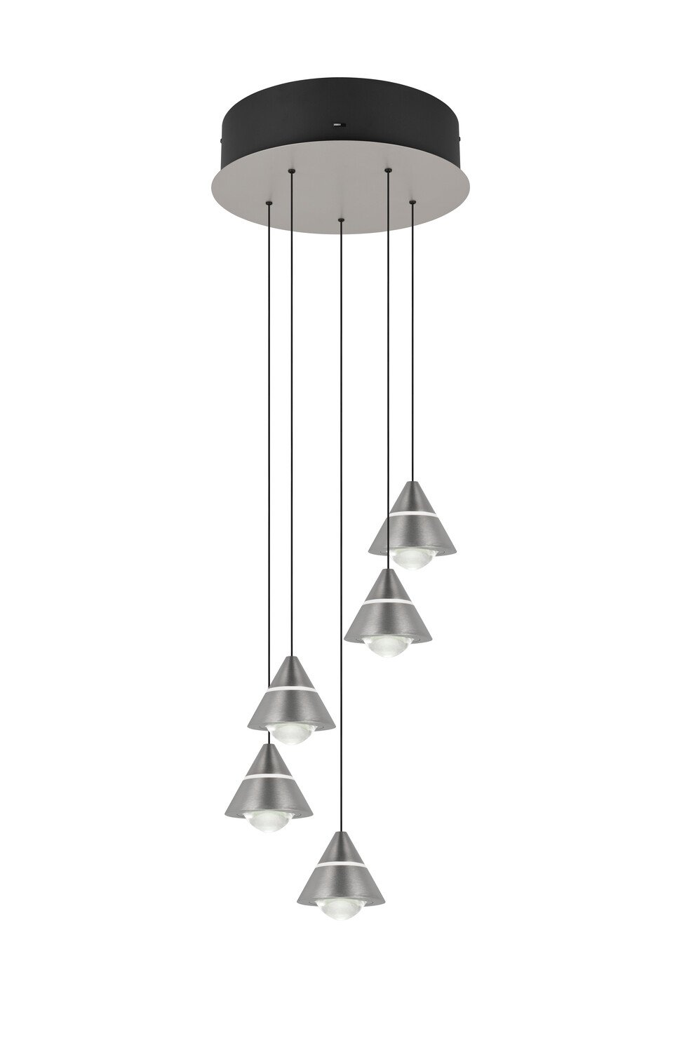 La cascade ajustable à l'infiniLa suspension ROMEO (337030507) est ludique et élégante. Grâce au système Lift Me, modifiez la hauteur de chacun des 5 spots coniques indépendamment pour créer une grappe, une spirale ou une pluie de lumière personnalisée.. Sa base ronde en nickel mat s'intègre partout. Profitez de la technologie CCT pour choisir une lumière chaleureuse ou neutre selon le moment. La gamme ROMEO intègre le système de réglage en hauteur "Lift Me" et la technologie CCT pour un confort absolu et se décline en 2 couleurs : | Type d'ampoule | Led SMD | | Puissance | 5*7W 5*700Lm