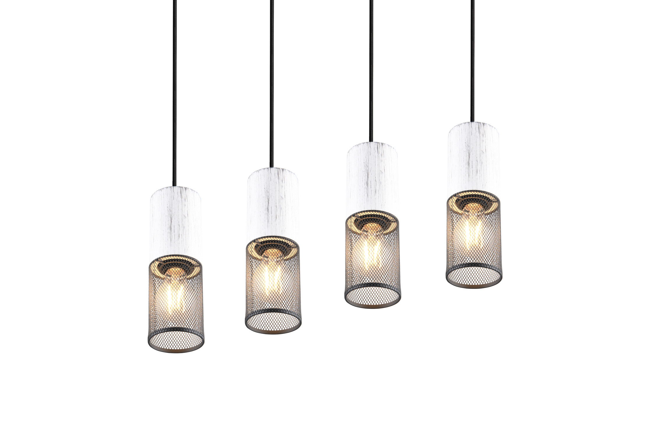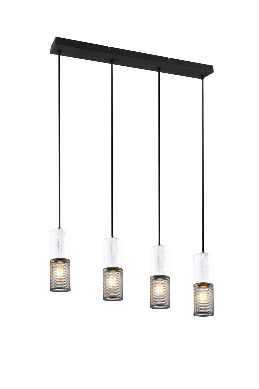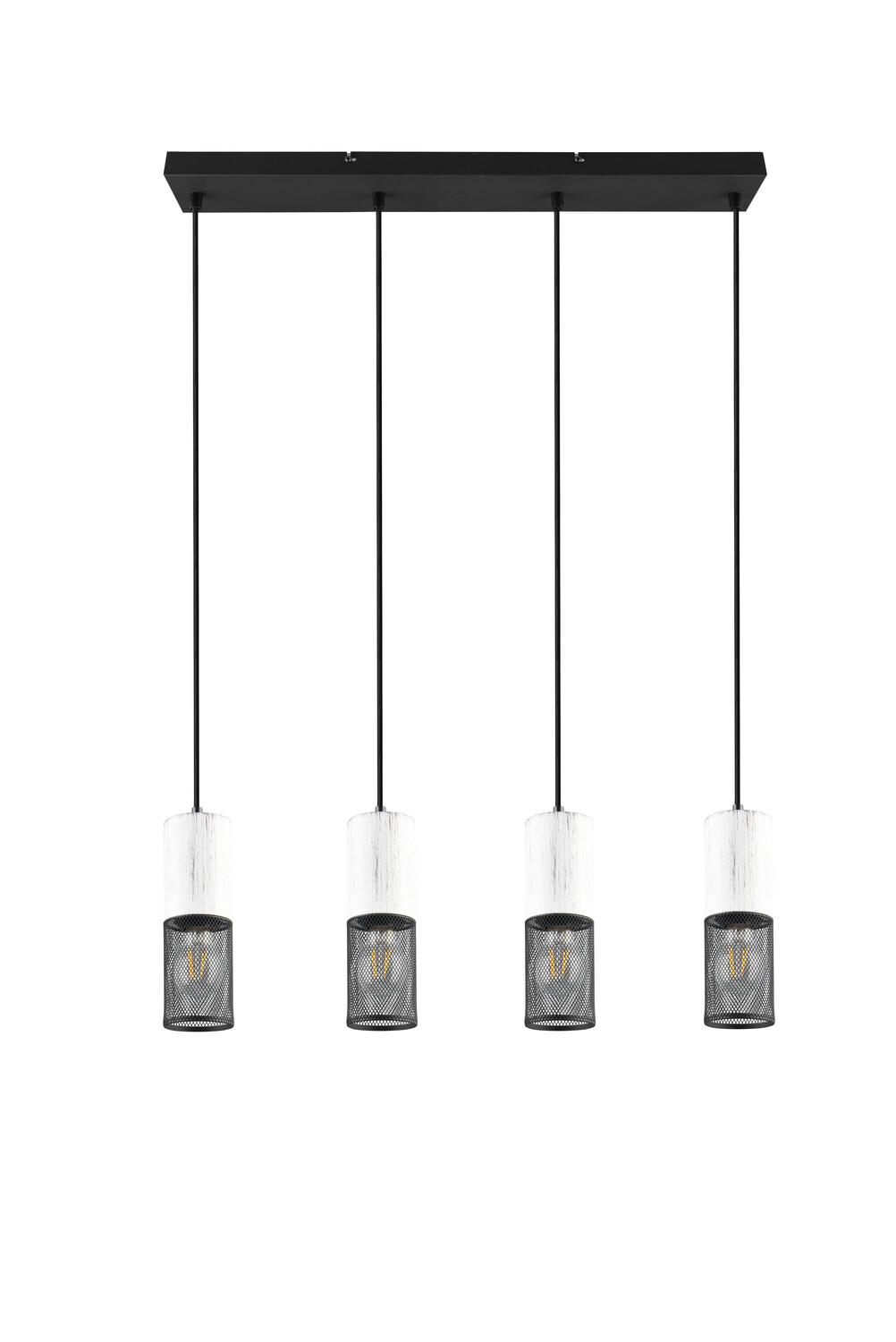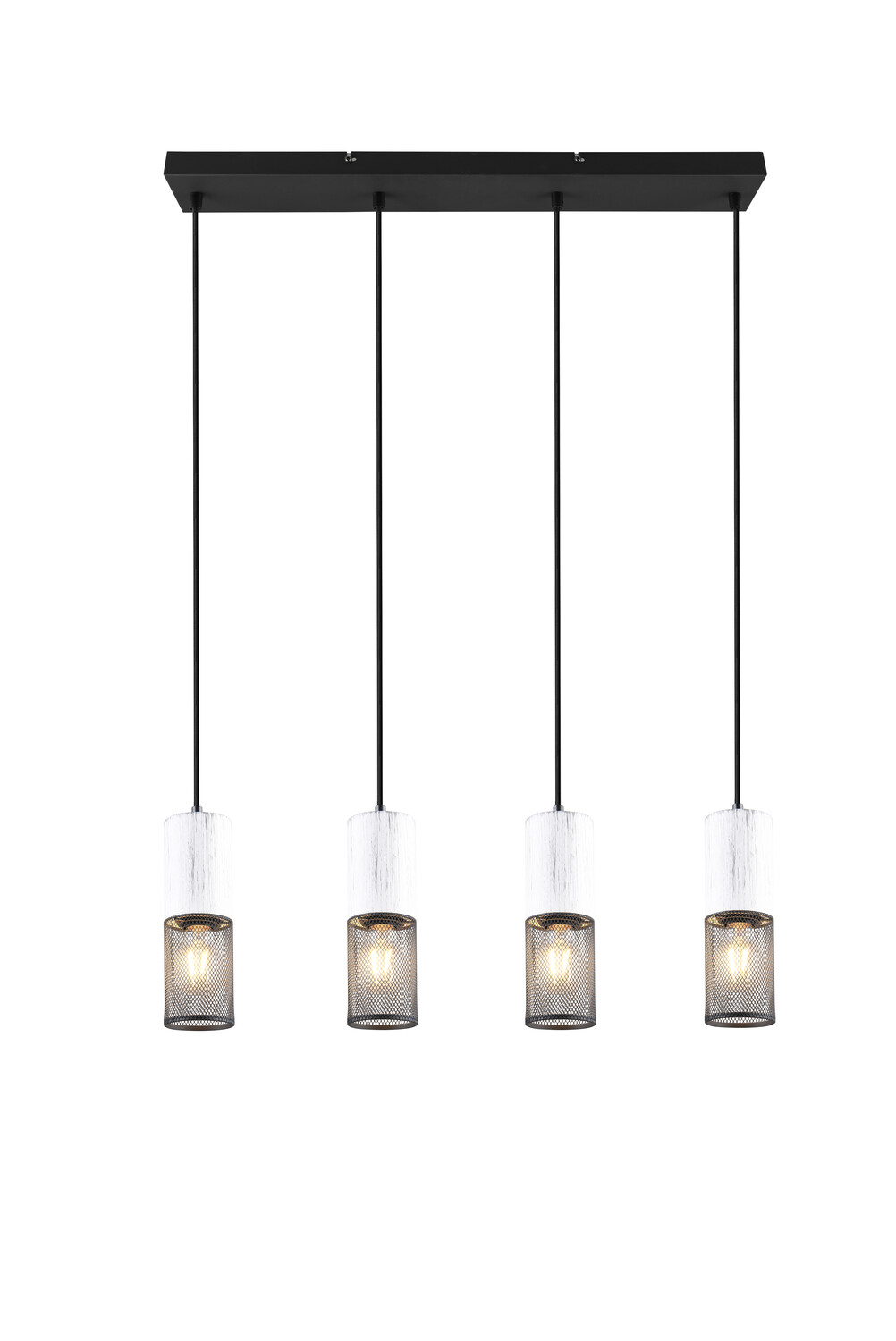 Suspension TOSH 4 lumières Noir mat & Bois blanc La suspension TOSH (304300434) est un lustre linéaire au style moderne et contrasté. Le métal noir mat s'associe au bois blanc pour un look contemporain épuré. Ses 4 abat-jours en résille métallique laissent apparaître les ampoules.