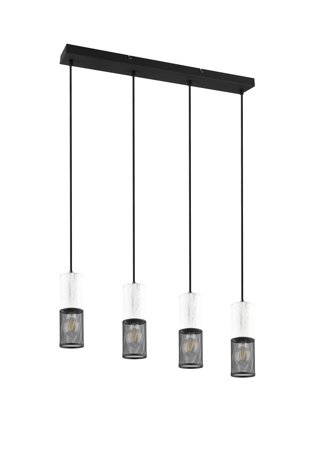 Collection TOSH Trio Lighting : luminaires styles industriels alliant métal noir mat et bois naturel. Style intemporel et tendance. | Type d'ampoule | Sphérique E14 (non inclus(e)) | | Puissance | max.4*10W | | Variation | Compatible | | Alimentation / Normes | 220V / CL1 | | Dimensions | 80* 650*max. 1500 mm | | Matière(s) Principale(s) | Métal & bois | | Couleur/Finition | Noir & blanc | | Position / Fixation | A fixer au plafond | | Utilisation | En intérieur | | Accessoire(s) | | | Garantie | 2 ans |